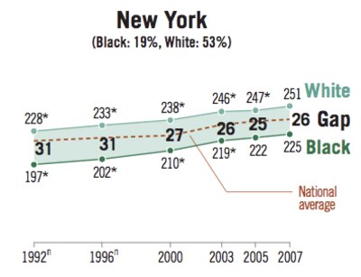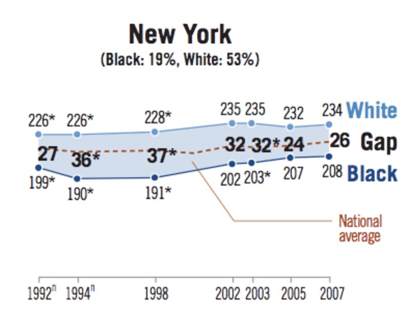 In 2007, black and white fourth graders across the nation had an achievement gap of 26 points on the math exam, just as they did in New York. For fourth grade reading, it was 27 points, whereas it was 26 points in New York. Gaps among eighth graders also mimicked the national numbers.