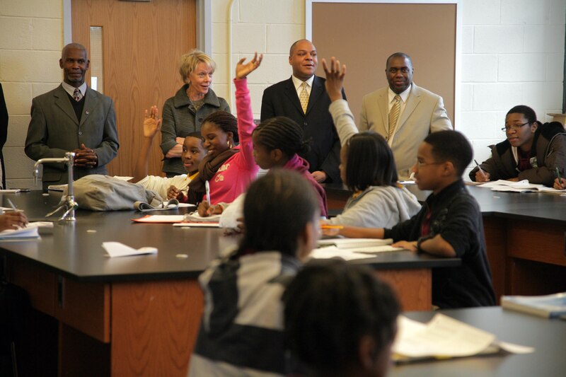 Black visited Medgar Evers College Preparatory School today, a high school in Crown Heights, Brooklyn, that admits students based on their middle school test scores and other academic measures. Nearly all Medgar Evers students graduate with a Regents diploma and some go on to top universities. President Obama praised the school back in July for giving its students the opportunity to earn college credits at the Medgar Evers College of The City University of New York before they graduate from high school.