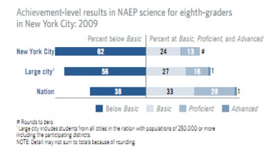 The city’s fourth graders fared better. Still, 44 percent scored below basic on the science tests. In other large cities, roughly the same percentage of students didn’t score above the “basic” bar.