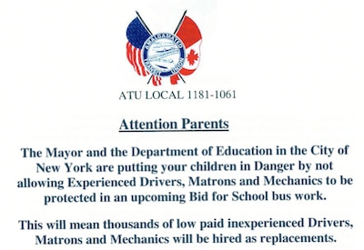 In a flyer handed out at the city’s meeting and being distributed by email, the ATU asks parents to lobby the city on bus drivers’ behalf. Telling parents that “there will be a stoppage to service to you,” the flyer warns parents that doing away with seniority protections could put children at risk.