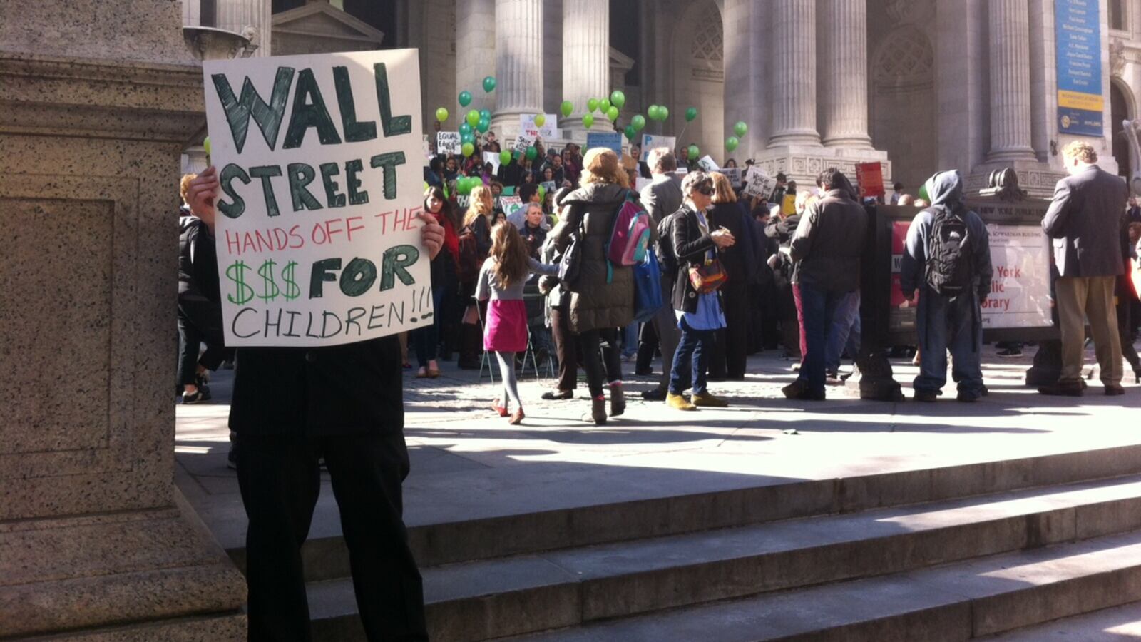 The protest also called on the state to deliver billions of dollars that the city is owed because of the Campaign for Fiscal Equity lawsuit. A plaintiff of that lawsuit, former City Council education committee chair Robert Jackson, was among the protesters, as was his successor, Danny Dromm, and representatives of dozens of advocacy groups. The protest was spearheaded in part by the elected parent councils from school districts across the city.