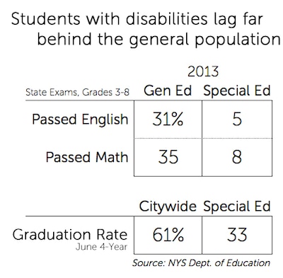 Whatever the cause, students with disabilities lag far behind other children in school. They have graduated at less than half the rate of their non-disabled peers for the past decade, with the gulf at times nearing 40 percentage points. Last year, just over 5 percent of the city’s special-needs students passed the state English exams, compared to over 31 percent of general-education students.