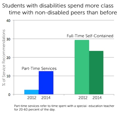 Those changes suggest that the city’s directives and the new budget formula had their desired effect: Students with disabilities have become less isolated. But the reform isn’t meant to simply move special-needs students around − it’s also supposed to help them perform better in school and eventually graduate.