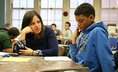 Fiorella Guevara, the community school director at M.S. 50 in Williamsburg, worked with a student during an art class. (Patrick Wall)