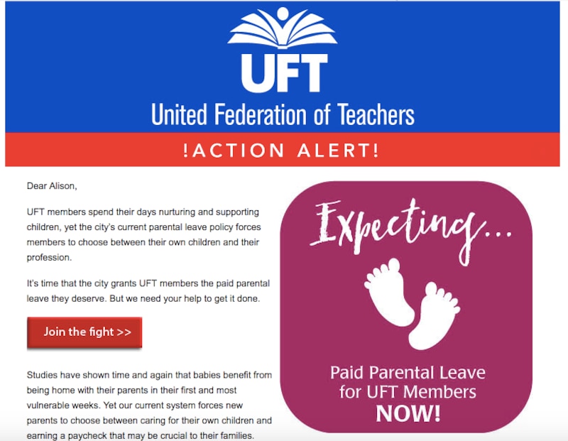 “The city’s current parental leave policy forces members to choose between their own children and their profession,” the union’s action alert email reads. “It’s time that the city grants UFT members the paid parental leave they deserve.”