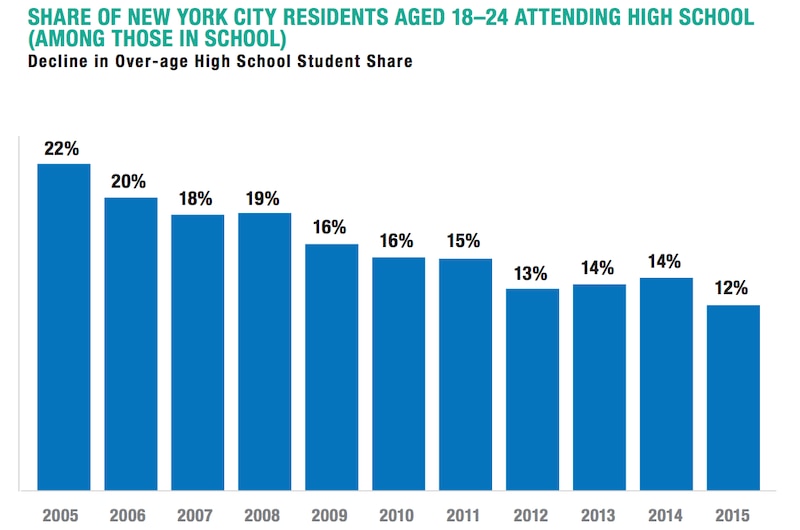 4. The percentage of the city’s students who are over 18 and still in high school has been falling — and the biggest drops are among students from low-income families, according to the report.