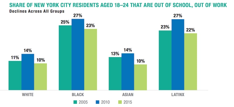 1. The proportion of young adults who are out of school and out of work has been trending downward since the recession. Seventeen percent of the city’s young adults were jobless and out of school in 2015, down from 22 percent in 2010.