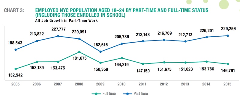 3. A big reason fewer young adults are out of work is the economy is improving. But most of the job growth has been in part-time employment, jobs that are lower-paying and come with fewer benefits. “Despite overall job growth, there has been no net increase whatsoever in full-time jobs for 18- to 24-year-olds,” the report notes.
