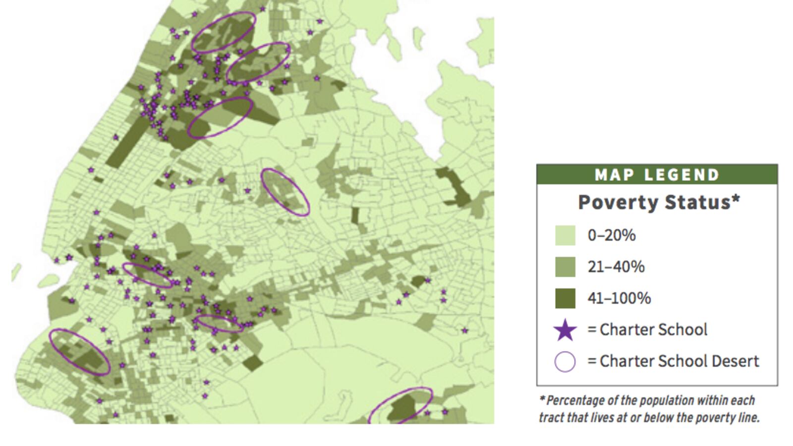 The report scanned all 42 states that allow charter schools for deserts and found them in 39, particularly in areas just outside of city boundaries where low-income families have moved because of gentrification. Its authors say the analysis is meant to help policy makers, charter operators, and parents alike.