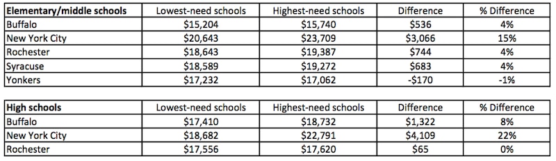 And in other large school districts in the state, the funding differentials are narrow to non-existent. High-need elementary and middle schools in Buffalo, for example, receive only 4 percent more funding than low-need schools do, and in Yonkers, needy schools actually received slightly less funding than those with a lower share of the city’s low-income students. (The report includes an interactive database that shows how most city schools are funded.)