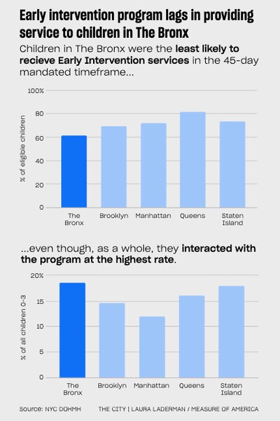 • In that same period, three out of five Bronx children deemed in need of services actually received them in the legally required timeframe — fewer than in any other borough, indicate records obtained by Measure of America/THE CITY from the state’s Department of Health.