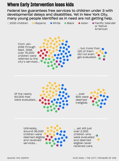 • Between January 2016 and September 2018, one in five black children and nearly one in seven Latino children referred to Early Intervention never received evaluations to determine whether they were eligible for services, according to reports from the city’s Department of Health and Mental Hygiene. Fewer than one in ten white children referred didn’t receive evaluations.