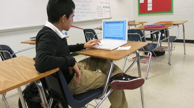 Colonial Middle schooler takes practice writing assessment online last week. (Tajuana Cheshier/ Chalkbeat TN)