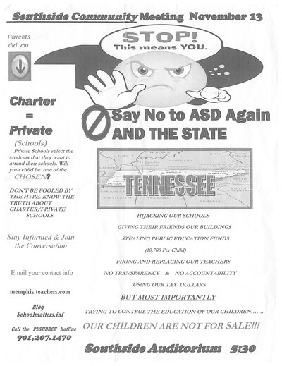 The Shelby County Teachers Coalition meeting will take place at Glenview Community Center at 5:30 p.m. and is open to the Memphis community. The coalition bills itself as an effort to inform parents about the process in which the state takes over low-performing schools and hands them over to charter schools or directly runs them.