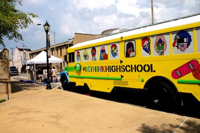 A yellow school bus emblazoned with the hashtag #rethinkhighschool parked outside of the Civil Rights Museum in downtown Memphis on Monday.