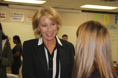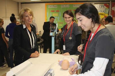DeVos visited Oakland High School in Murfreesboro, a fast-growing university town south of Nashville, and spoke with students taking classes in health sciences, automotive technology and mechatronics.