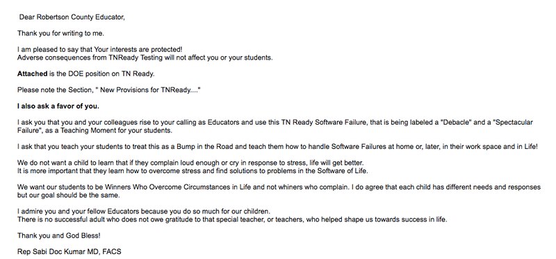 Rep. Sabi Kumar, a Springfield Republican, sent an email Wednesday to Robertson County educators after several urged him to advocate for this year’s state test results not counting on their evaluations.