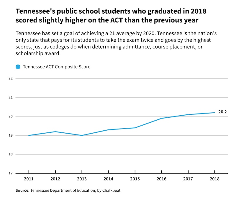 On a scale of 1 to 36, the state’s public school students who graduated in 2018 scored an average of 20.2, up from 20.1 the previous year, as a record number of Tennesseans took the test.