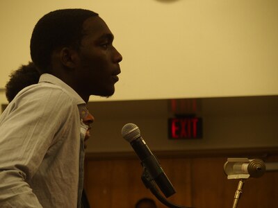 Patrick Johnson, a senior at G.W. Carver College and Career Academy, speaks to school board members about bus passes for high school students. (Laura Faith Kebede/Chalkbeat)