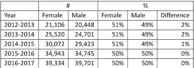 However, even a 50–50 split is different than the average traditional U.S. public school, which enrolled 3 percent more male than female students in the 2014–15 school year.