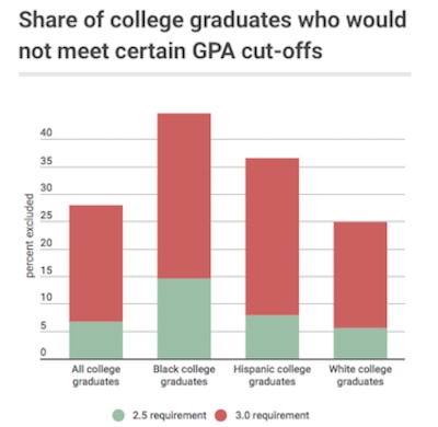 The most common requirement is a 3.0 GPA, which would exclude nearly half of black college graduates and over one-third of Hispanic college graduates, according to a 2012 federal report. (A note of caution: this data is somewhat old, covering students who graduated in the 2007–08 school year. There does not appear to be more recent comprehensive data.)