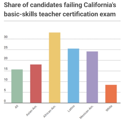 State-specific exams exhibit similar trends. In California, according to data from 2010 to 2015, white candidates are much less likely to fail the basic academic skills exam.