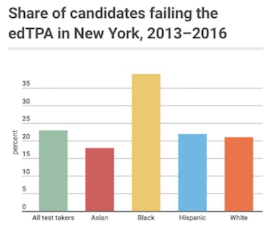 A national report found that there was no difference in performance between Hispanic candidates and white candidates. But black candidates performed substantially worse than average. In New York, black test takers are nearly twice as likely to fail the edTPA as white or Hispanic candidates, according to the state.
