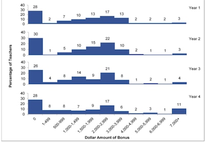 The research focuses on a federal program known as the Teacher Incentive Fund, and compares schools that gave all teachers an automatic 1 percent bonus to those schools that gave bonuses based on classroom observations and student test scores. About 130 schools across 10 districts were randomly assigned to one of the groups.