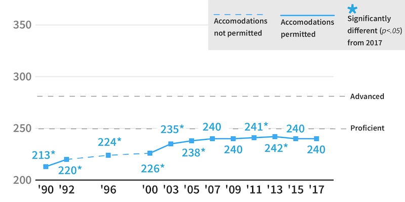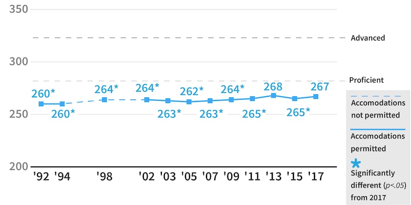 The 2017 results showed only tiny differences from 2015: a loss of 1 point in both subjects in fourth grade, and a gain of 1 point in both subjects in eighth grade. Only the grade eight reading improvement was statistically significant compared to the last test.