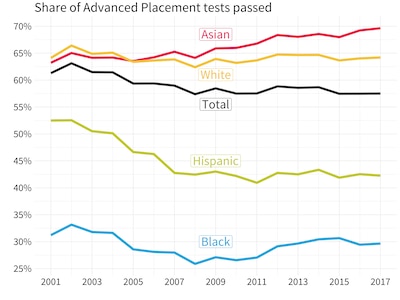 The success of those students varies widely. Only about 30 percent of exams taken by black students and 42 percent of exams taken by Hispanic students received a passing score in 2017, compared to 64 percent of exams taken by white students.
