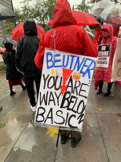 Unlike in those states, teachers unions are powerful entities in California, where the state government is also a Democratic stronghold. Rather than rail at state lawmakers, then, Los Angeles teachers’ signs and chants targeted Beutner, a former investment banker, civil servant, and newspaper publisher who has led the district since May. “Hey, hey, ho, ho, Austin Beutner’s got to go,” was a popular chant. Some handmade signs featured his image, and others called him out by name.