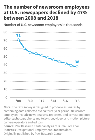 I also started to worry about newspapers beyond New York City. The rules of public schools were being rewritten all across the country. We needed reporters to cover that. Eleven years later, I can see that I was right to worry. Sadly, I wasn’t worried enough. Between 2008 and 2018, the number of newsroom employees at U.S. newspapers declined by 47%.