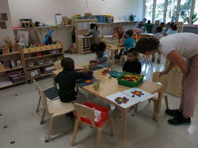 The teacher, Ms. Jessica, floated around the room to ask students questions about what they were doing, but was careful not to tell them what to do. Students at the model centers much of their day in self-directed play in centers. The center is using a program called the Creative Curriculum, which emphasizes playing as a way to learn.