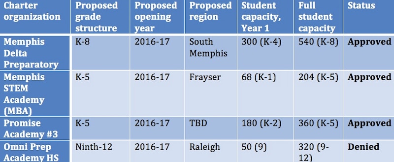 Promise Academy got permission to open a third location with elementary school grades; Memphis Business Academy will open an elementary school with a science, technology, engineering and math focus; and Memphis Delta Preparatory will open its first school, for K-8. All propose to open in 2016.