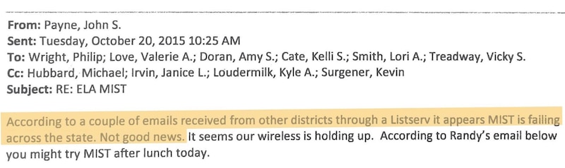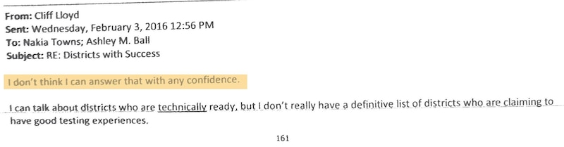 But emails show that the state knew that most districts were having difficulties. When one district’s technology coordinator asked the state for a list of districts ready for the online exam, officials came up short.