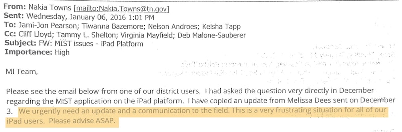 The emails contain numerous alarming reports about practice tests gone awry. They also show that miscommunication between officials with the Tennessee Department of Education and Measurement Inc. made it difficult to fix problems in time for launch.