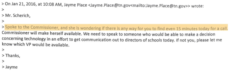 “She is wondering if there is any way for you to find even 15 minutes today for a call,” McQueen’s chief of staff wrote. “Commissioner will make herself available. We need to speak to someone who would be able to make a decision concerning technology in an effort to get communication to directors of schools today.”