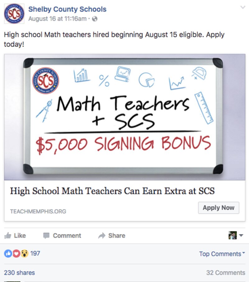 A shortage of high school math teachers in Memphis has Shelby County Schools willing to award a $5,000 signing bonus to those hired after Aug. 15.
