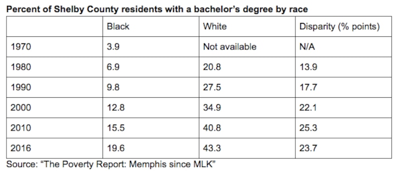 But the gap between the percent of black and white students finishing college has increased since 1980 from about 14 to 24 percentage points. Memphis youth age 16 to 24 are the mostly likely in the U.S. to not be in school or working, according to a 2015 report by a research group that studies economic opportunity.