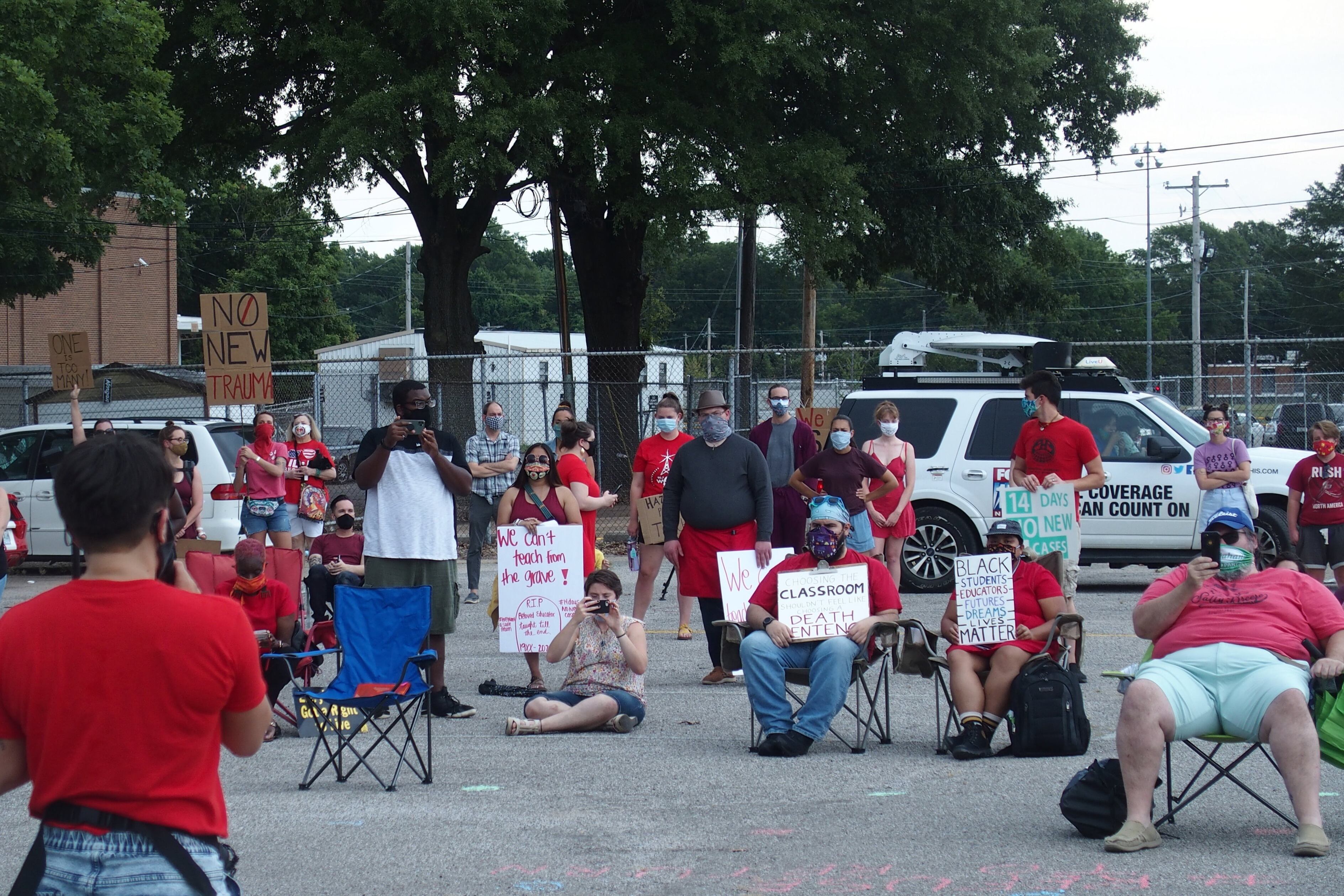About 80 teachers and supporters who share her concerns rallied in front of Shelby County Schools central office on Tuesday afternoon. Donning masks and bringing lawn chairs and signs to the parking lot, participants chanted “Education is a right. This is why we have to fight,” and “Whose schools? Our schools!”