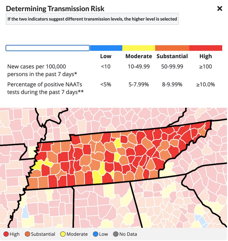 The most stringent of the five requirements is the “severe conditions” clause, defined in the bill as a county average of at least 1,000 new infections for every 100,000 residents. The Centers for Disease Control and Prevention, however, defines “substantial” community spread as 50-99 new cases per 100,000 residents and “high” as more than 100. By the CDC’s measurements, community transmission in most of Tennessee remains substantial or high.