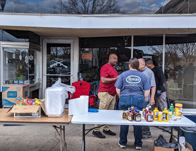 Kevin West, who is also an industrial engineer at Tyson Foods, got his company to donate the smoker, a cooking team, and food. By Tuesday evening, they had cooked 600 pieces of chicken, 50 pounds of pot roast, 20 pounds of hot dogs, 10 packs of chicken wings, eight logs of Italian sausage, and four packs of ribs.