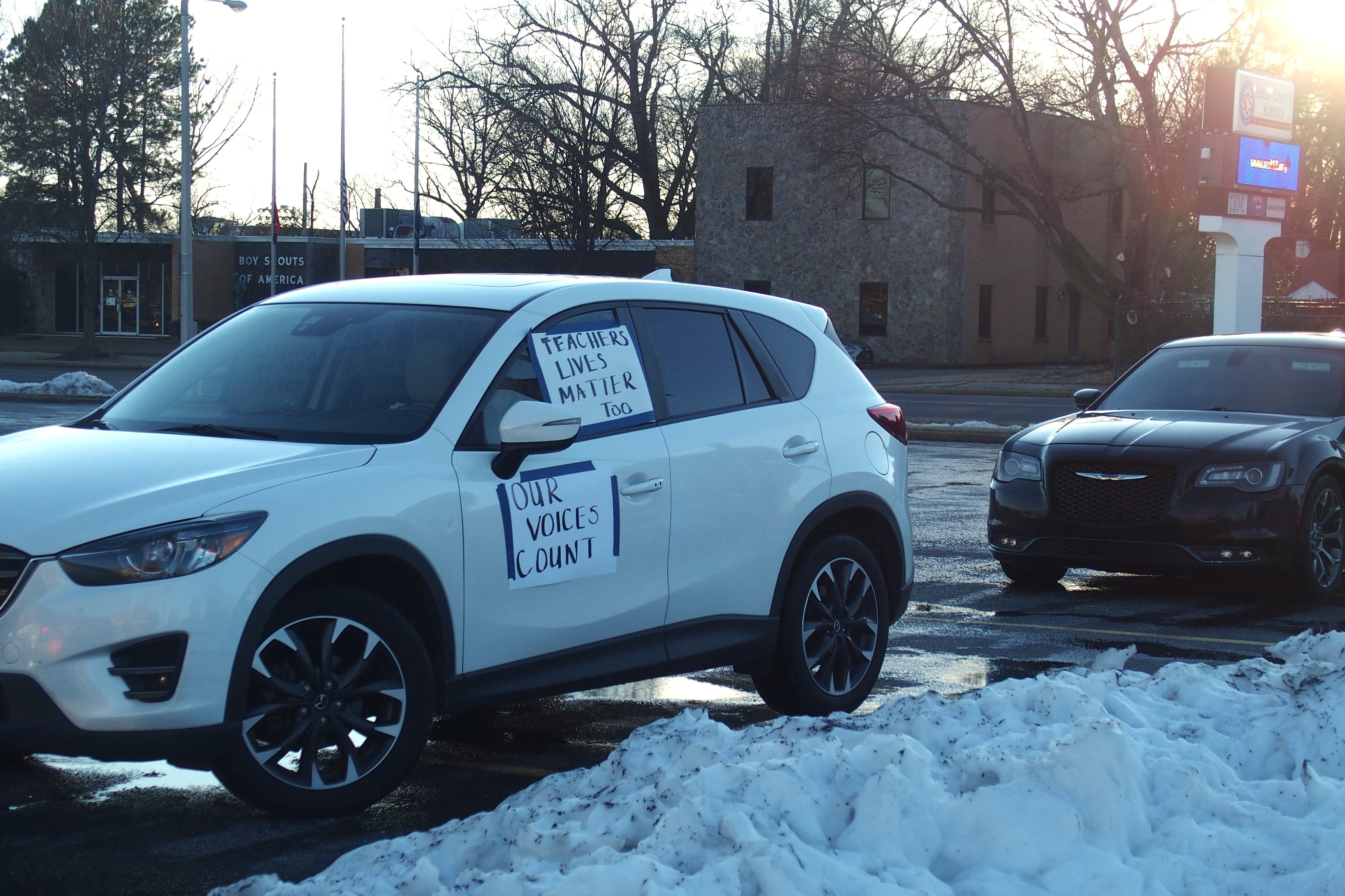 About 25 educators from Madihalli’s group drove by the district’s central offices Tuesday evening, ahead of a school board meeting, to share their concerns about building cleanliness and teacher accommodations. Teachers held signs that read “Teachers Matter” and “Our Voices Count” and honked their horns as they drove around the parking lot.