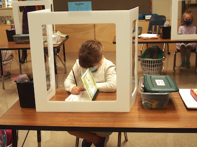 As masked students stopped in the hallways, they looked down to see if they lined up with floor markers set 6 feet apart and backed up when needed. At the entrance of each classroom, there was a table with a large bottle of hand sanitizer. Some had boxes of disinfectant wipes. Inside classrooms, students worked on their tablets with headphones behind mostly clear desk shields. As students rotated through the cafeteria for lunch, each class was assigned a row and spaced out to have two students at each table.