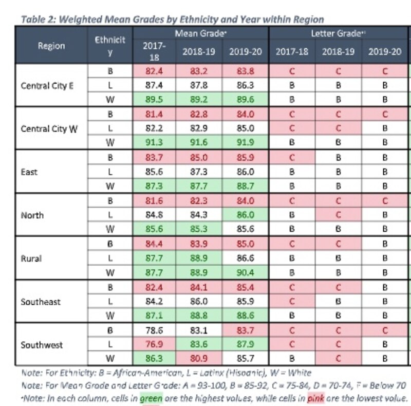 As the report notes, “By 2019-20, means for African-American students were in the high C to low B range, while means for Latinx students were in the low to mid B range, and means for White students were in the low to high B range.”