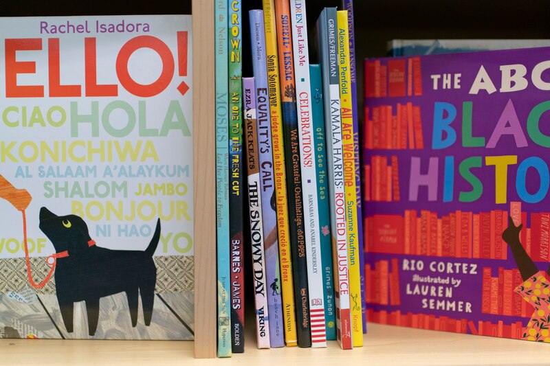 On a large colorful rug, several schoolchildren sat with their legs crossed. Others stretched out on their stomachs. All were poring over pages and unraveling words and stories from books like “Pete the Cat,” “Time for Breakfast,” and “The Tiny Seed.”
