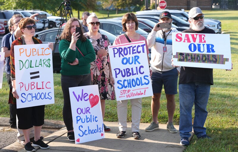 Before and after the hearing, parents and other residents who supported their local board’s decision gathered outside the district’s central office to voice their concerns and display signs opposing Hillsdale.