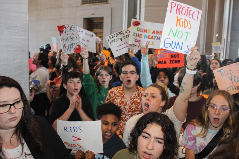 Chanting “Save our kids!” and “Not one more!” protesters gathered outside of legislative chambers where lawmakers were in session and could hear the students’ shouts reverberating from the Capitol rotunda.