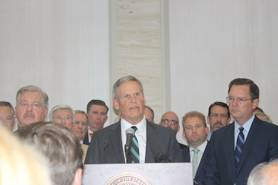 The governor was flanked by top Republican lawmakers as he spoke with reporters for the first time in the week since the shooting.