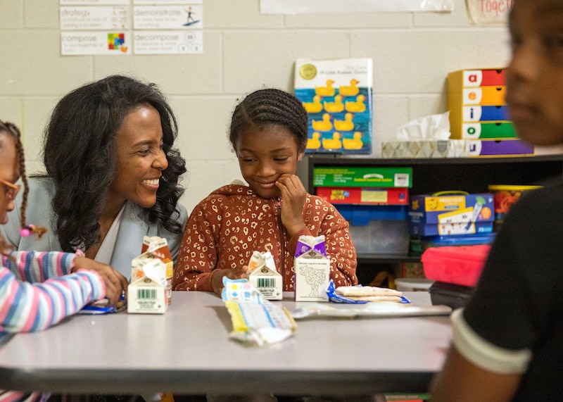 Not her own desk at district headquarters, but a student desk in a classroom. She sat amid Northaven Elementary School students learning how to put together and define compound words like “horsefly” and “blackbird,” and later with Grandview Heights Middle School seventh graders solving math word problems about super-cold temperatures.